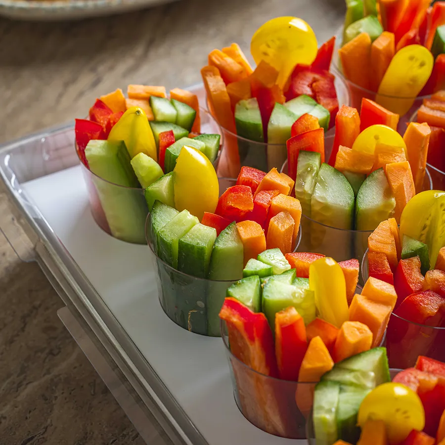 ירקות טריים חתוכים ומוכנים לאכילה.