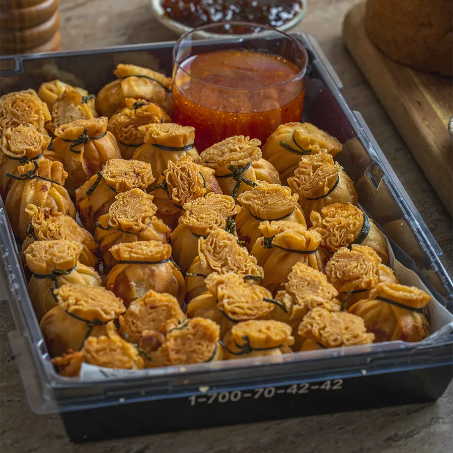 מאפה מיני פילו במילוי ירקות בתוספת רוטב צ'ילי מתוק.
