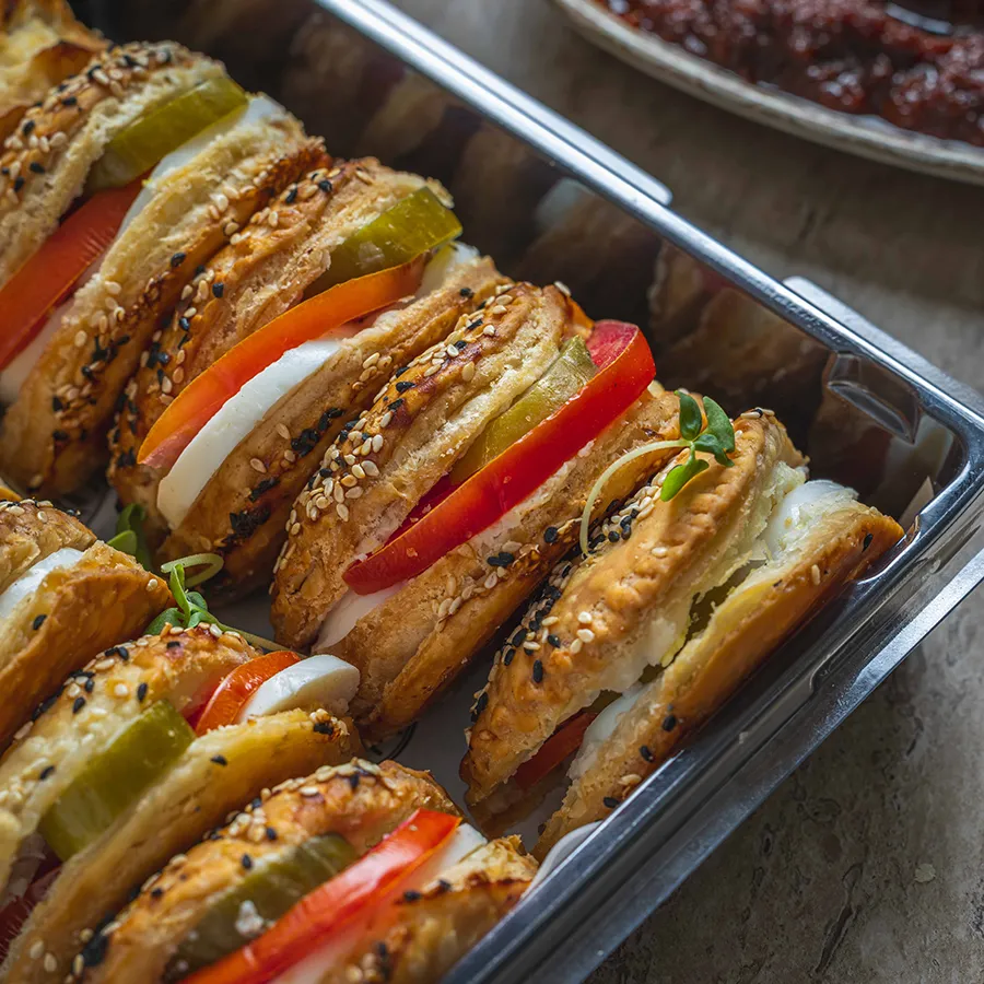 מאפה בוריקיטס במילוי: ביצה קשה, עגבנייה וחמוצים.
