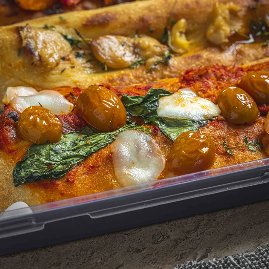 פוקאצ'ה אוורירית בליווי ירקות אנטי פסטי, מוצרלה, שרי ובזיליקום, שום קונפי וטימין.