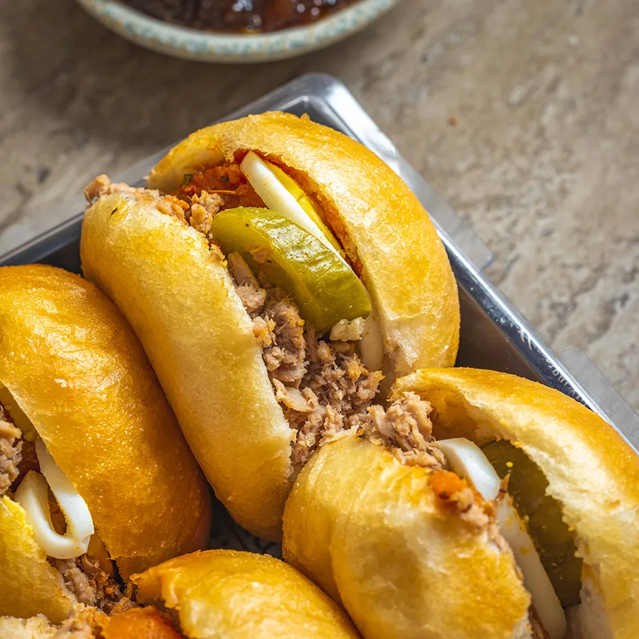 לחמנייה עגולה מטוגנת במילוי: ממרח לימון כבוש טונה, ביצה קשה, גזר מזרחי ומלפפון חמוץ.