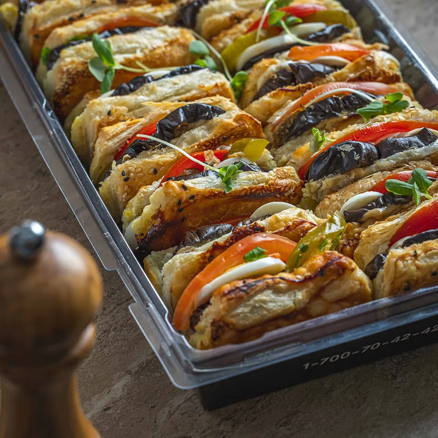 מאפה במילוי תפוח אדמה, חציל אפוי, מלפפון חמוץ ועגבנייה.