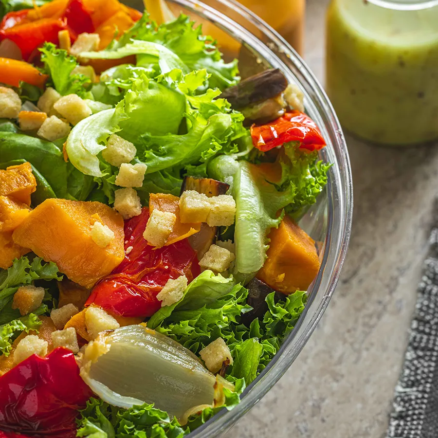 עלי רוקט, חסה לליק, ירקות אנטי פסטי קלויים וקרוטונים ברוטב וינגרט