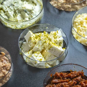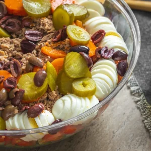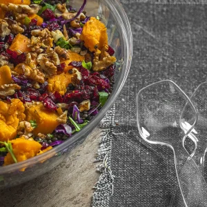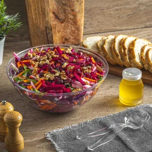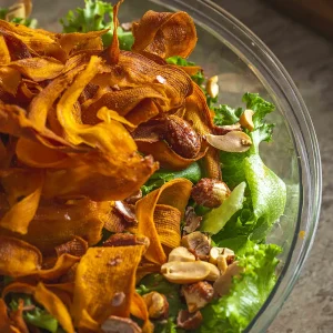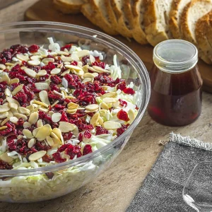 כרוב סגול, כרוב לבן, גזר, ושקדים פרוסים ברוטב חמאת בוטנים מתקתק.