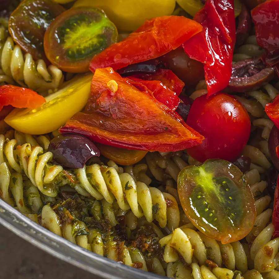 פסטה ביסלי, פלפל קלוי, עגבניות שרי, פסטו, שקדים פרוסים וזיתי קלמטה