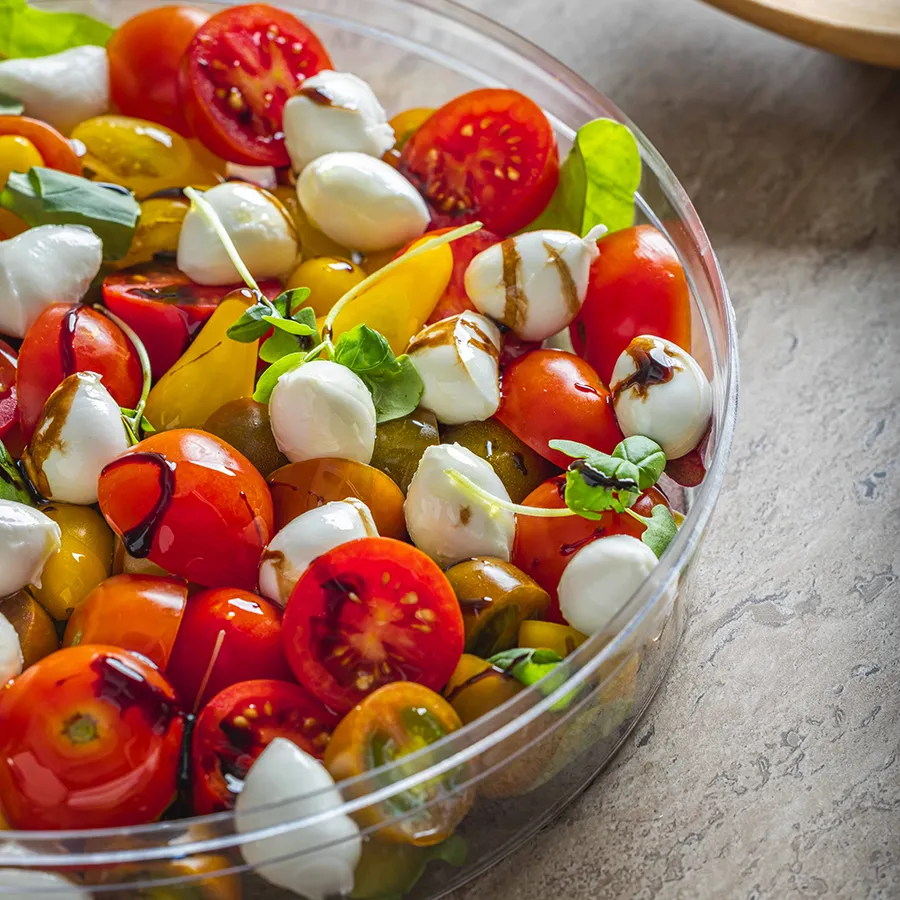 מיקס עגבניות שרי צבעוני, עליי בייבי, כדורי מוצרלה ברוטב שמן זית, לימון ובלסמי